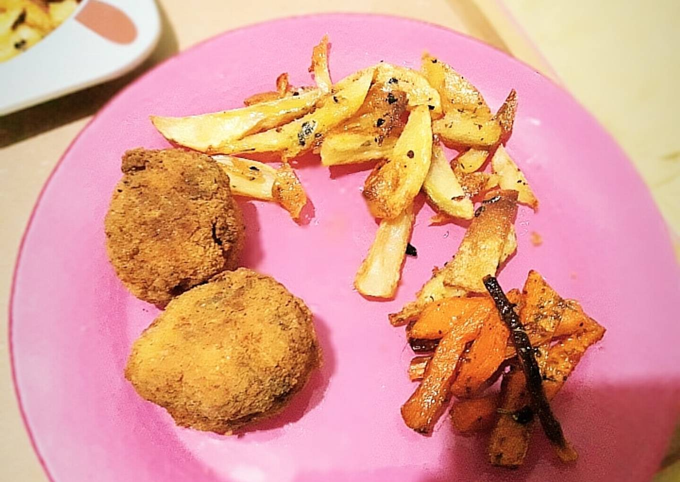 - Cortar las papas, la zanahoria y calabaza en baston. Echar aceite a la fuente y condimentar (utilice provenzal, orégano y ají molido) cocinar en horno 180° de ambos lados