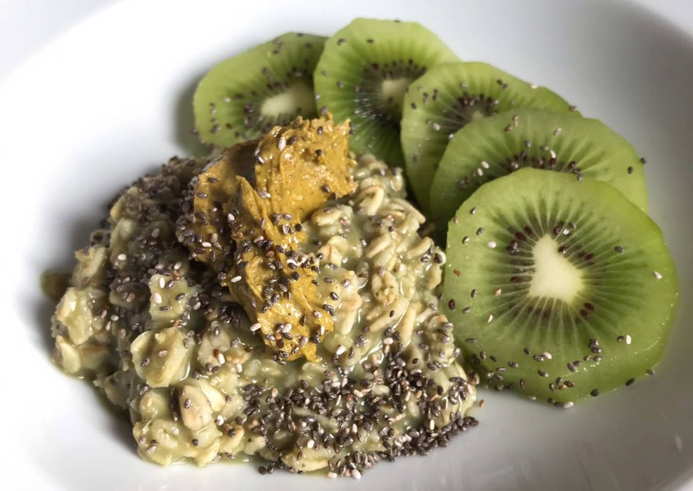 Avena con matcha, mantequilla de pistache y kiwi