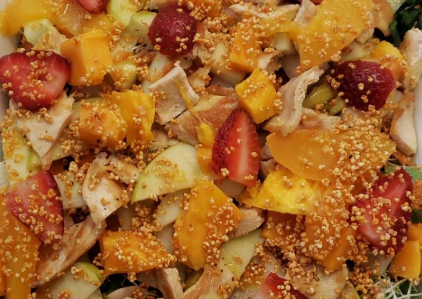 - Se revuelve ya toda la fruta y la verudra en un refractario junto con la pechuga se espolvorea el amaranto y un poco de miel!