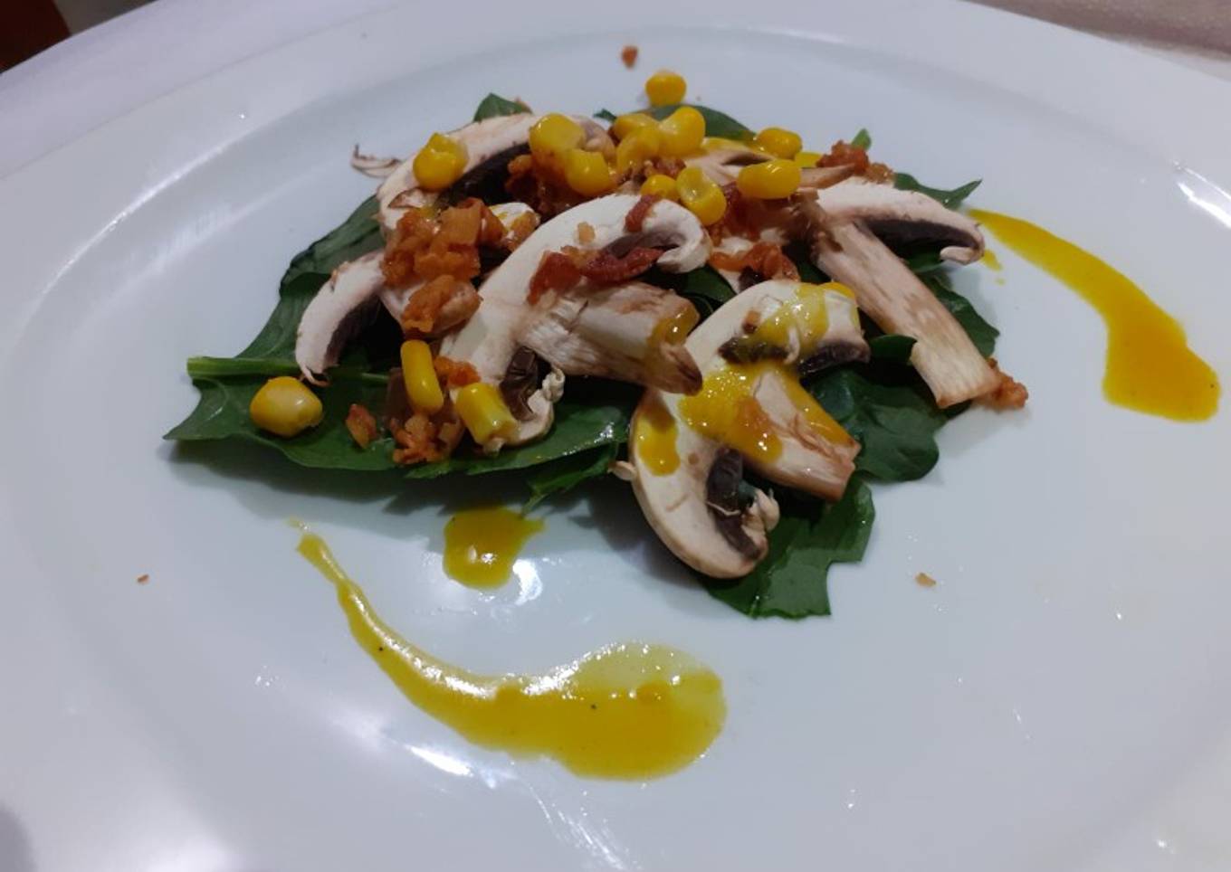 - Ahora pasamos a montar, poniendo nuestras espinas, champiñones y los granos de elote, y listo, tendríamos nuestra ensalada lista.