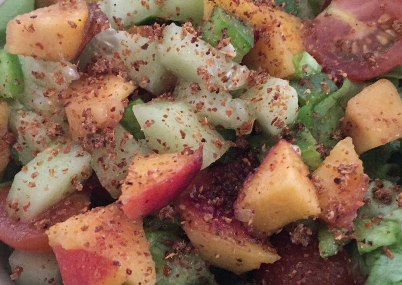 - Poner en un recipiente la Lechuga, los nopalitos, el durazno, el pepino y los tomates, mezclar un poco. Añadir el jugo del Limón, aceite de oliva y el Tajín a tu gusto.