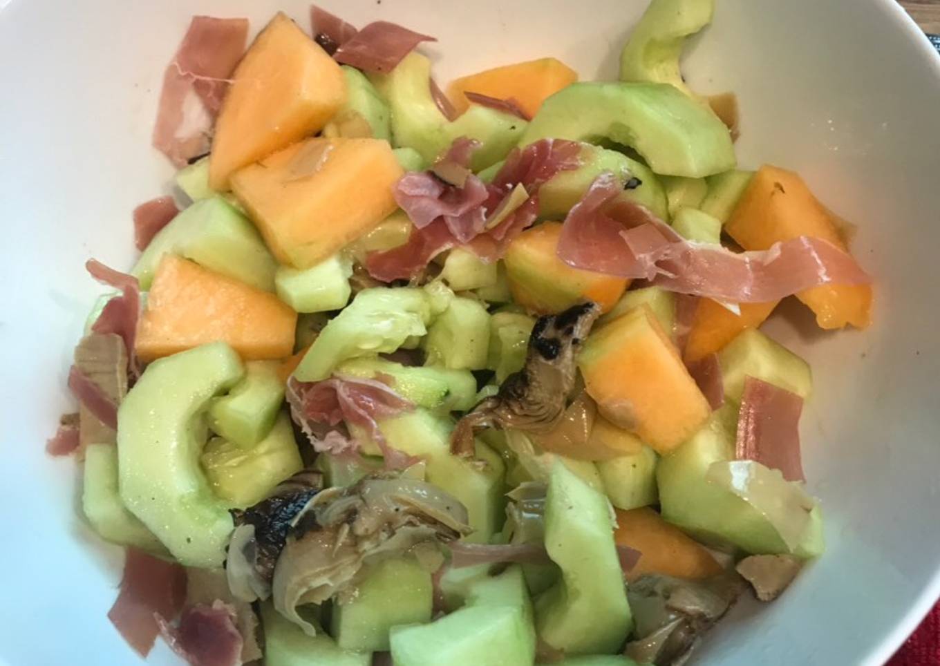- Cortar el melón en cubos. Incorporar alcachofa. Picarla. Agregar jamón serrano en trocitos