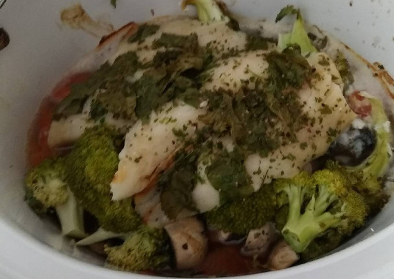- Agregar el brócoli, tomate y dientes de ajo(opcional) en forma de una cama