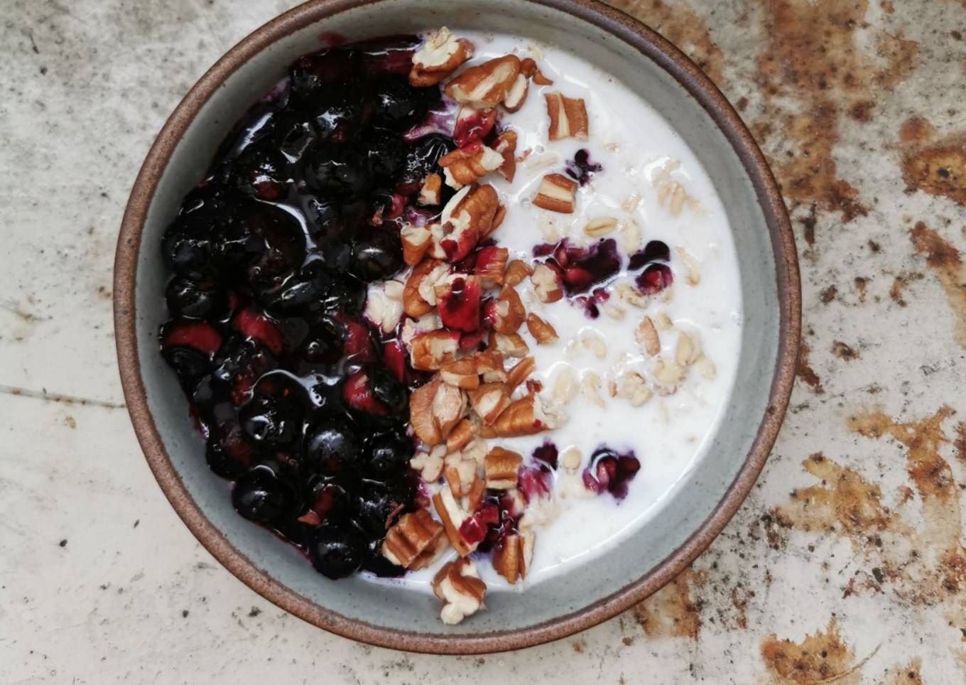 - Servir la avena en un tazón y decorar con los blueberries cocinados y las nueces. Disfrutar.