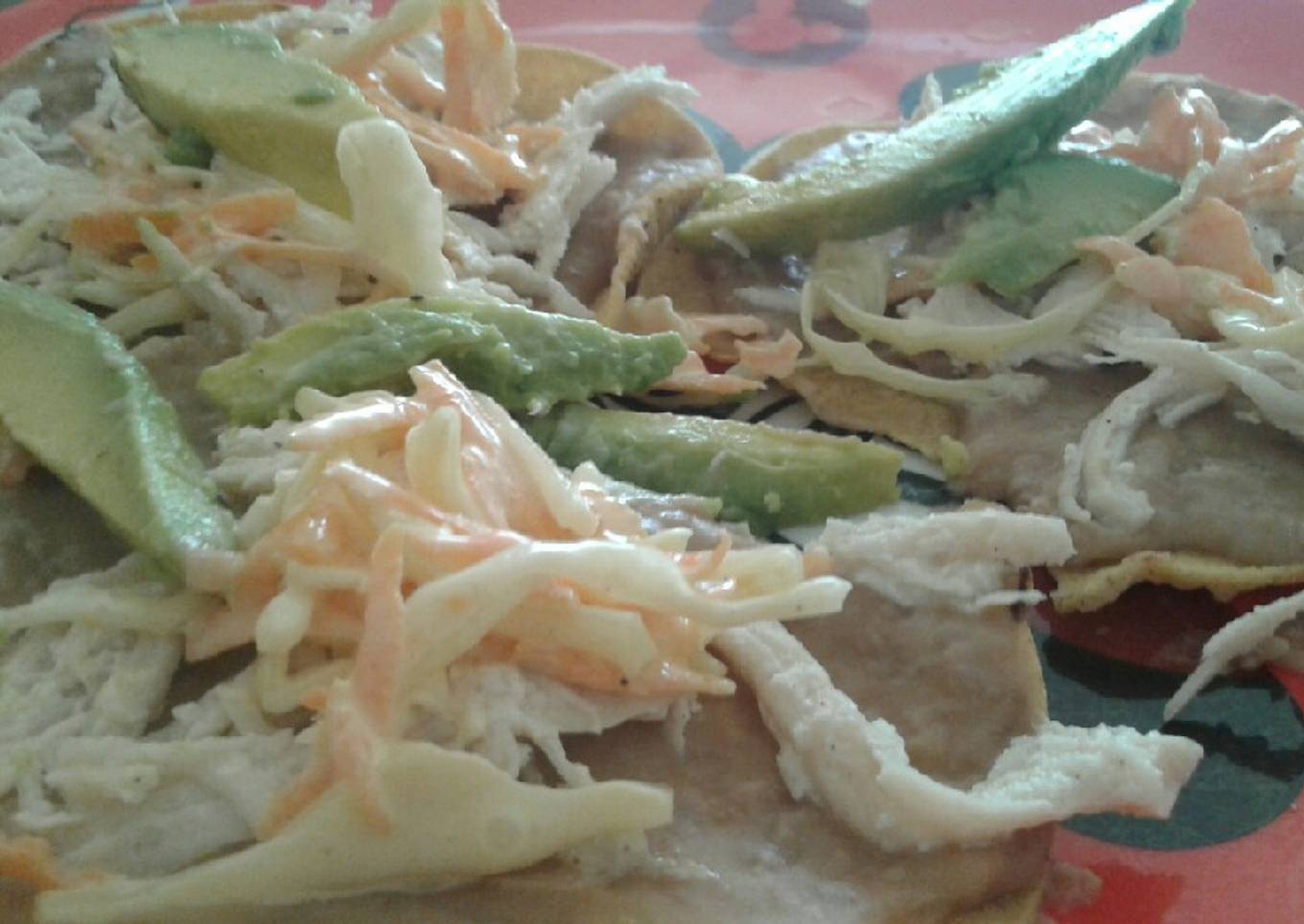 - Ahora si embarramos la tostada con los frijoles, esparcimos pollo encima col con zanahoria bañamos con nuestro aderezo colocamos rebanada de aguacate y vamossssss a celebrar