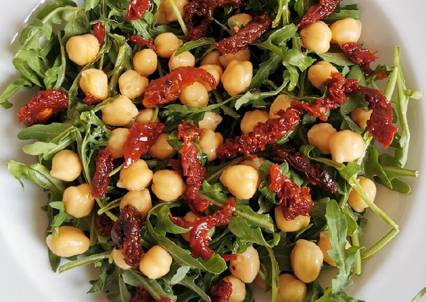 Ensalada de arúgula, garbanzo y tomate deshidratado