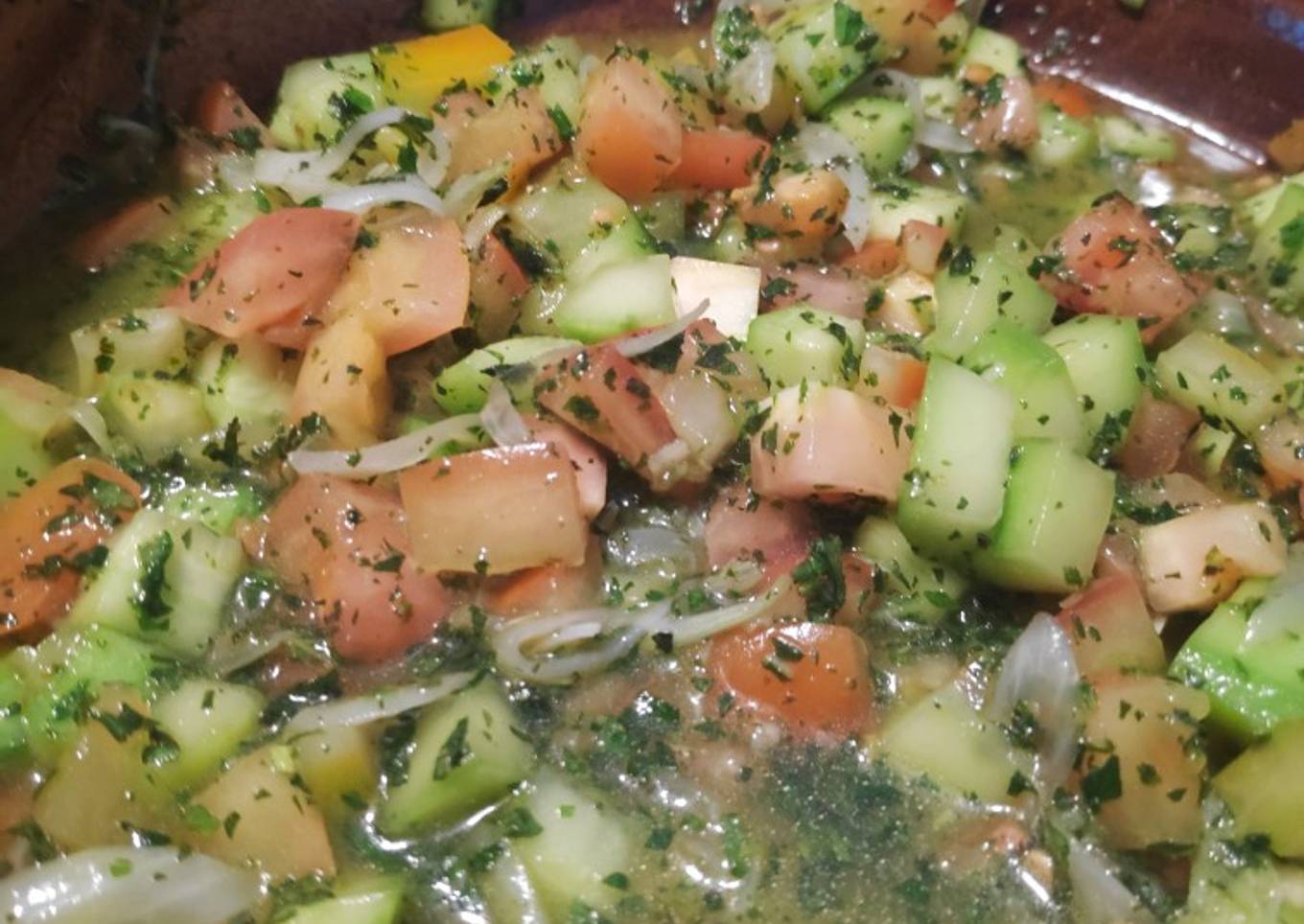 - Picar la hierbabuena y el perejil colocarlo en un molcajete junto con los ajos sal y aceite de oliva, moler hasta hacer una pasta. Colocarla en una ensaladera junto con los tomates, pepino picados y la cebolla, agregar el jugo de las naranjas agrias y sazonar.